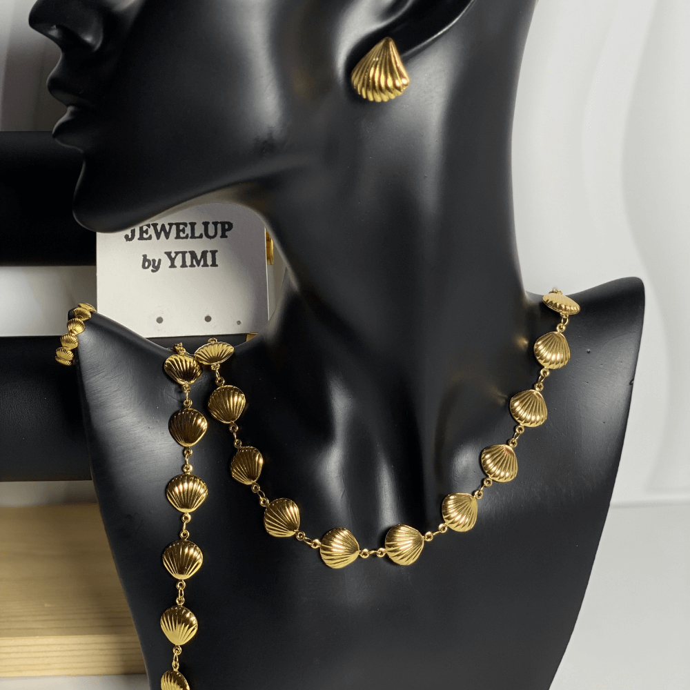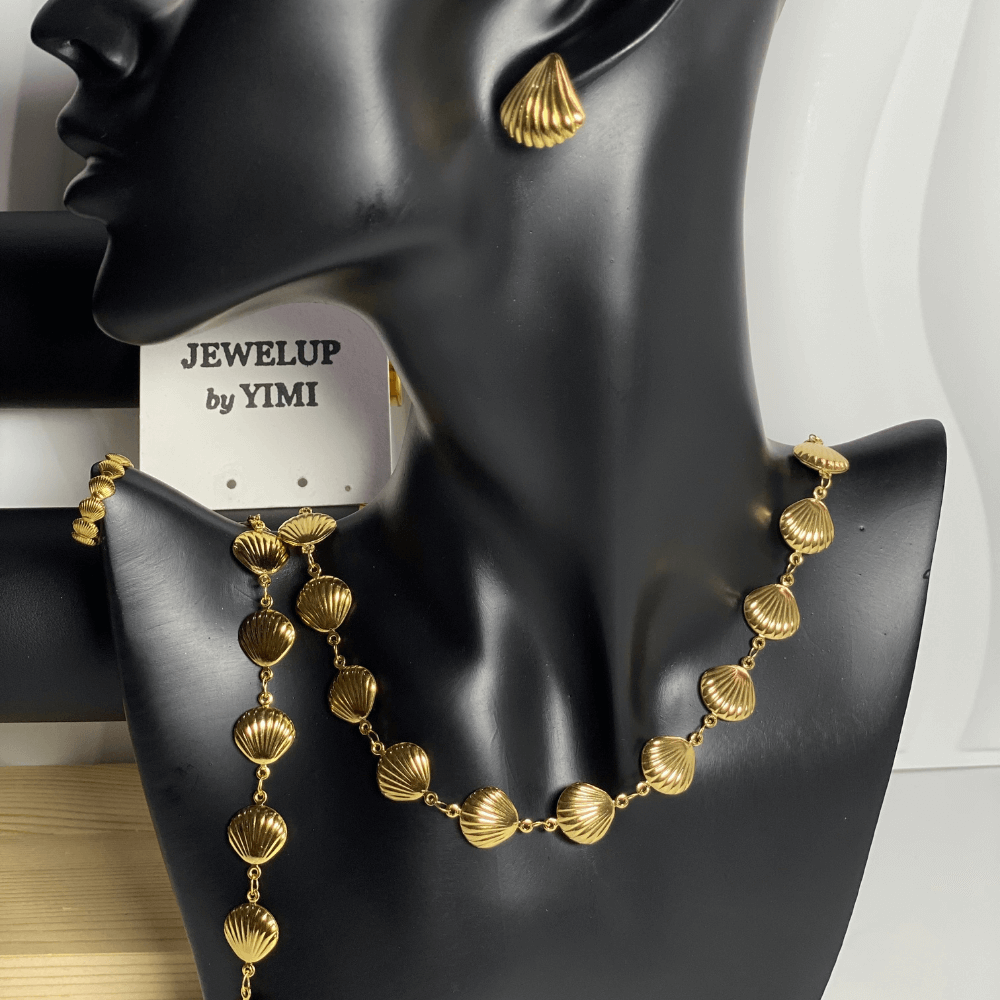 Shell inspired chunky earrings, necklace, ring and bracelet set.